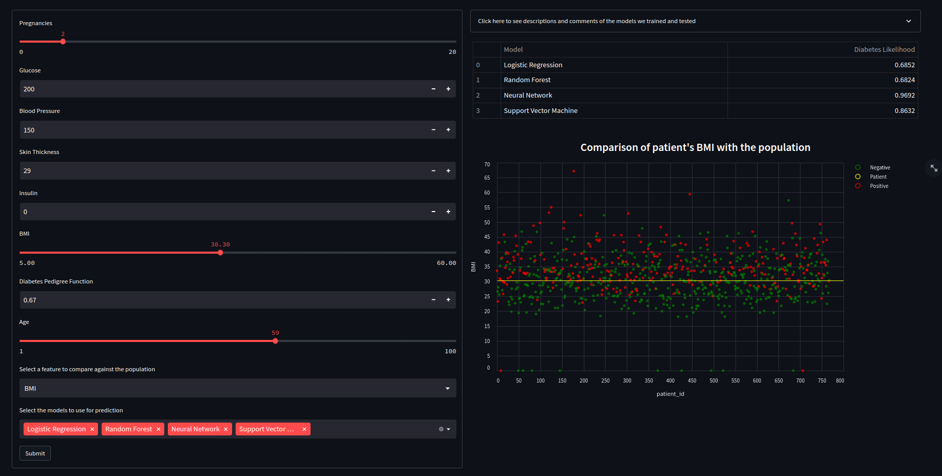 - Developed a comprehensive web application that predicts diabetes risk based on individual health parameters. The system incorporates interactive data visualizations to help users understand the key factors contributing to diabetes development, providing both predictive insights and educational value.