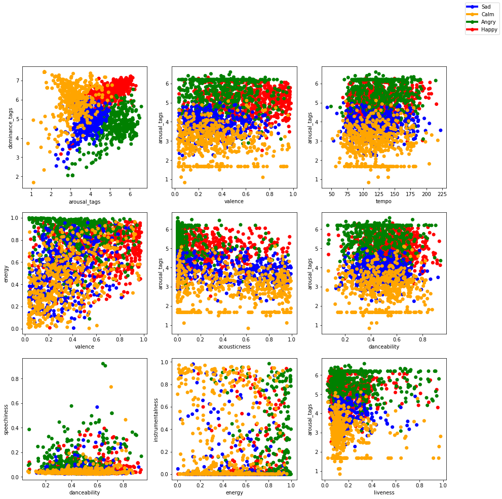 - Implemented various machine learning algorithms to predict song mood and emotional characteristics. The visualizations below demonstrate key insights derived from the analysis, showcasing the relationship between musical features and emotional content.