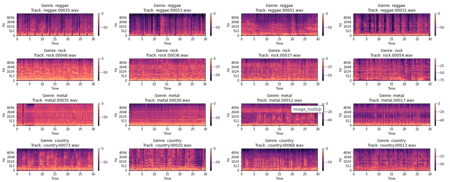 - Leveraged multiple data sources including the Million Song Dataset, GTZAN, and Spotify API to create a robust training dataset. The analysis incorporated both spectral features (mel-spectrogram visualization shown below) and metadata features to capture comprehensive musical characteristics.