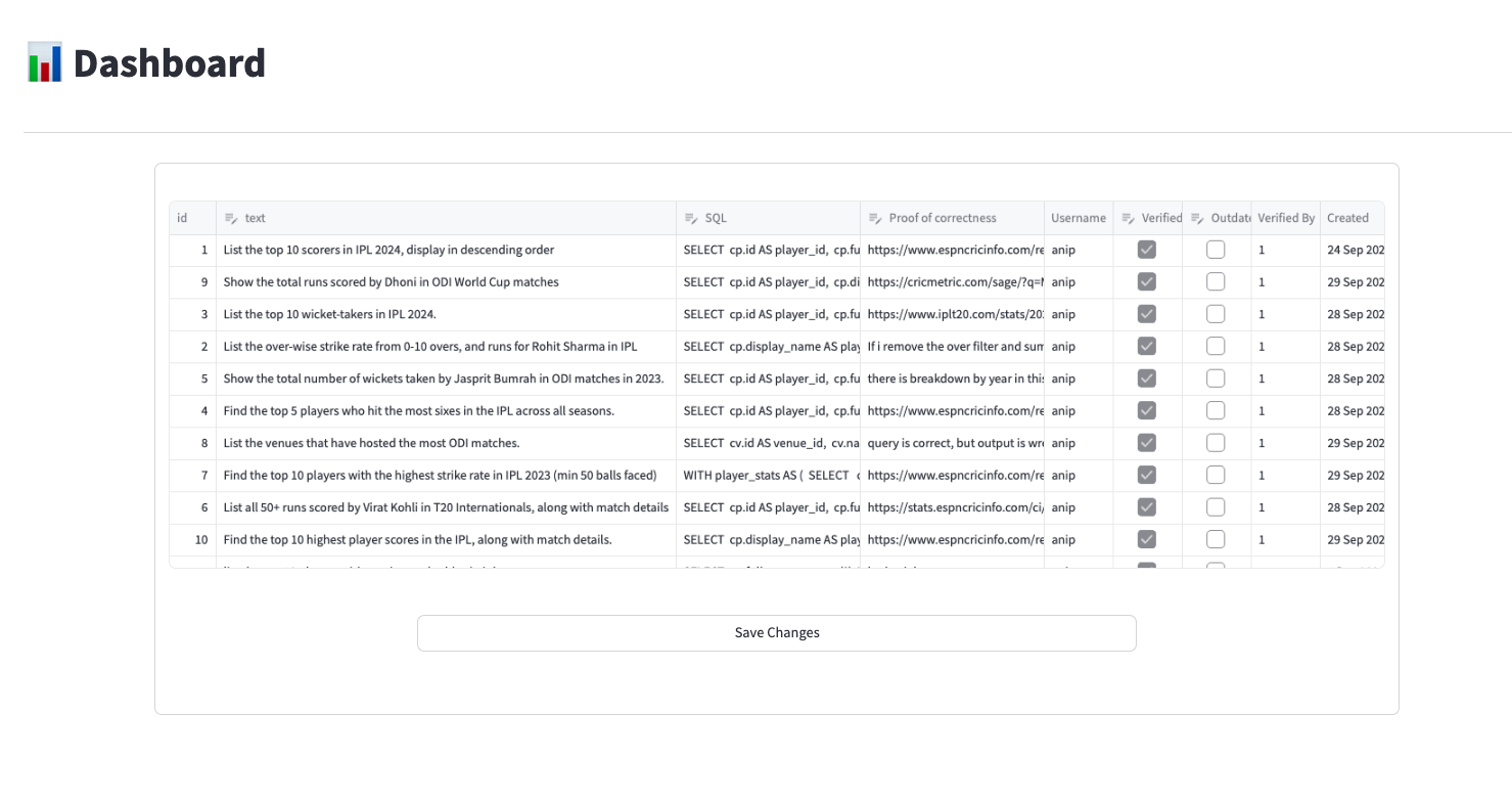 - Step 2: Verification - “Managers” had access to review the fine-tuning data created by testers. Their goal was to run the generated queries, verify correctness, and mark them as “verified” to ensure data quality.