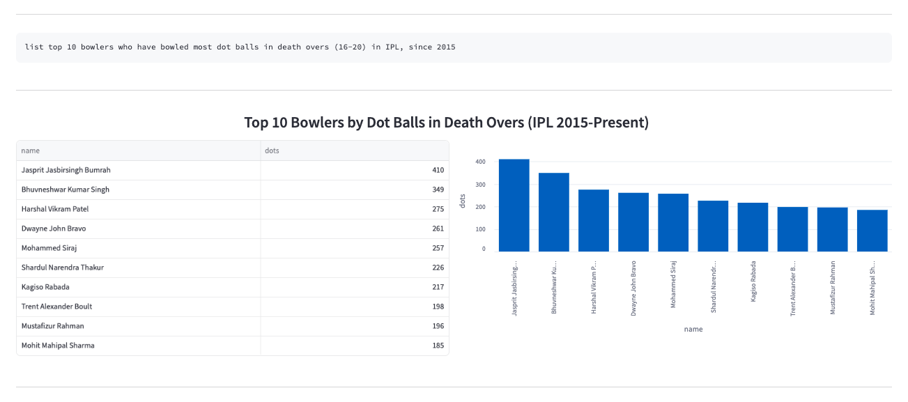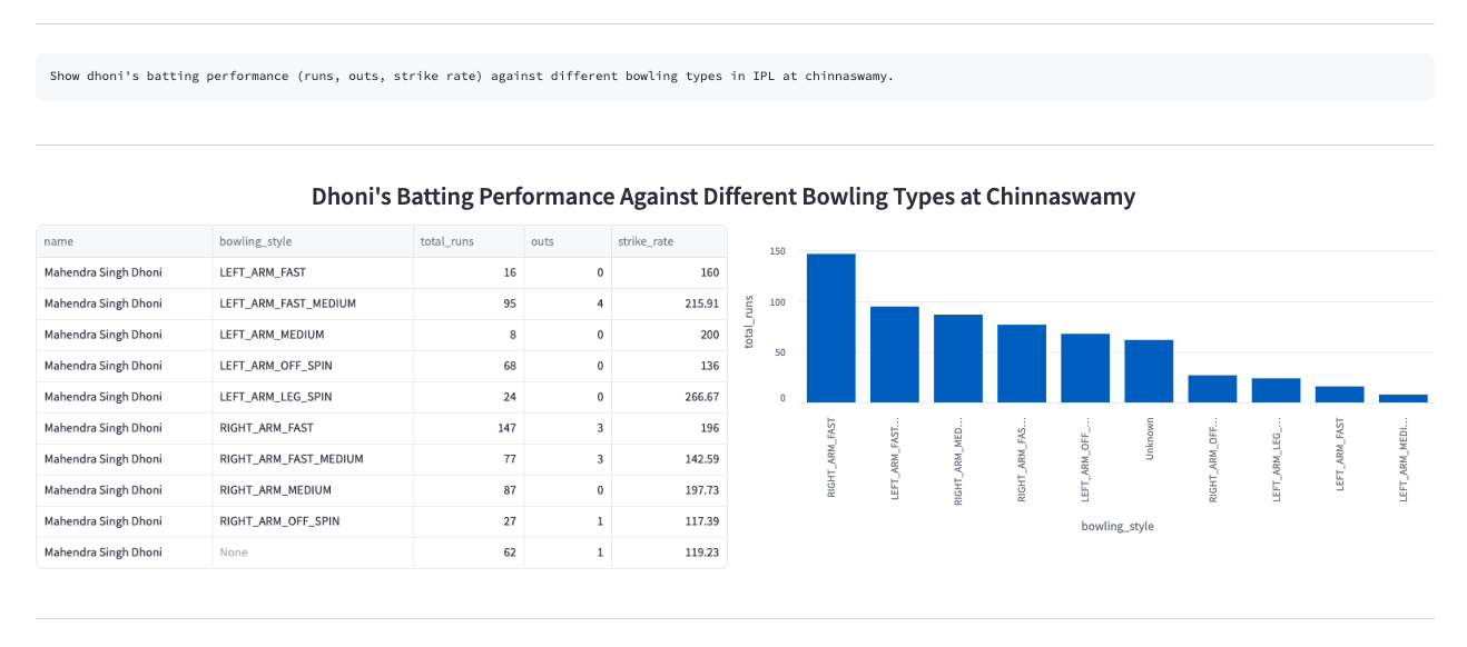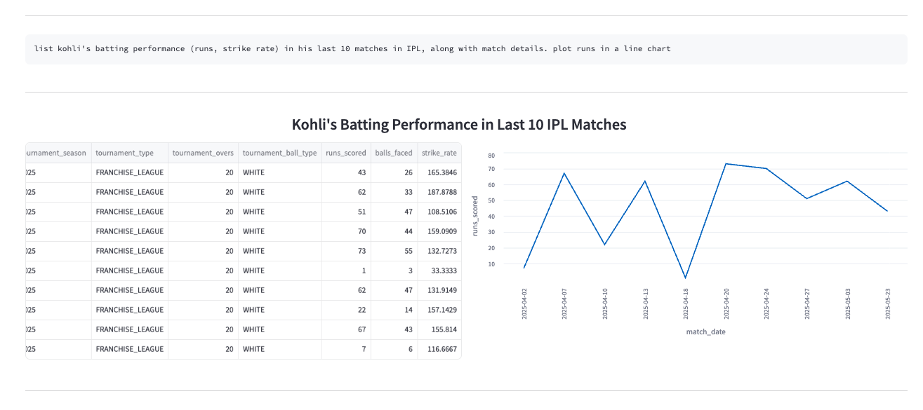 - The fine-tuned models started performing exceptionally well for even very specific cricket insights. These models were deployed at inference time in the playground, with automated plot generation that adapts based on the type of query asked.