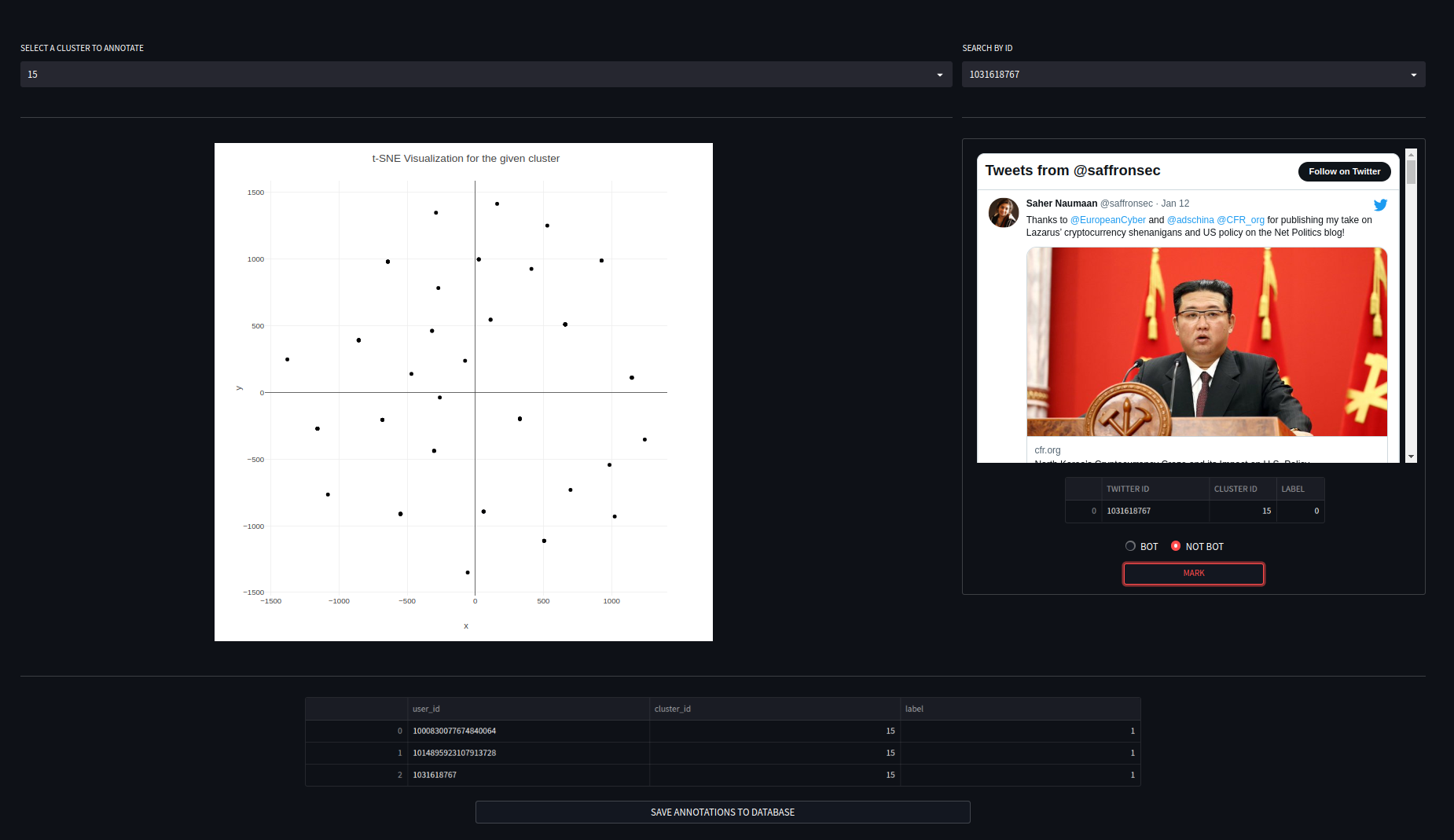 The interactive bot detection system operates through a multi-stage process: retrieving unlabeled clusters from an SQLite database, presenting account characteristics via t-SNE visualization, and enabling users to examine individual profiles alongside pre-calculated NLP-based bot likelihood scores. This human-in-the-loop approach allows for informed decision-making regarding account bot status, with user feedback continuously improving the system’s precision.